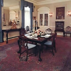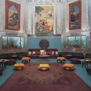 تابلوها و عناصر فرهنگی: احتمالاً تابلوهای نقاشی کلاسیک، خوشنویسی، یا پرتره‌های تاریخی که فضا رو از یک ساختمان اداری صرف جدا می‌کنه.