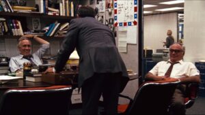 فیلم «همه مردان رئیسجمهور» (All the President’s Men) ساخته آلن پاکولا در فضایی عمدتاً مرموز و پیچیده جریان دارد. دکوراسیون فیلم، بیشتر در فضاهای بسته و اداری قرار دارد که نمایانگر جو خفقانآور و پرتنش تحقیقات روزنامهنگاران است. طراحی داخلی دفاتر و اتاقهای روزنامهنگاری در «واشنگتن پست»، فضای بیروح و سردی دارد که بهخوبی نشاندهندهی بیاعتمادی و تلاش برای کشف حقیقت در یک دوران پرآشوب است. استفاده از رنگهای خاکی و مبلمان ساده، علاوه بر ایجاد حس واقعگرایی، به تشدید فضای دلهرهآور و تنشهای درونی شخصیتها کمک میکند.