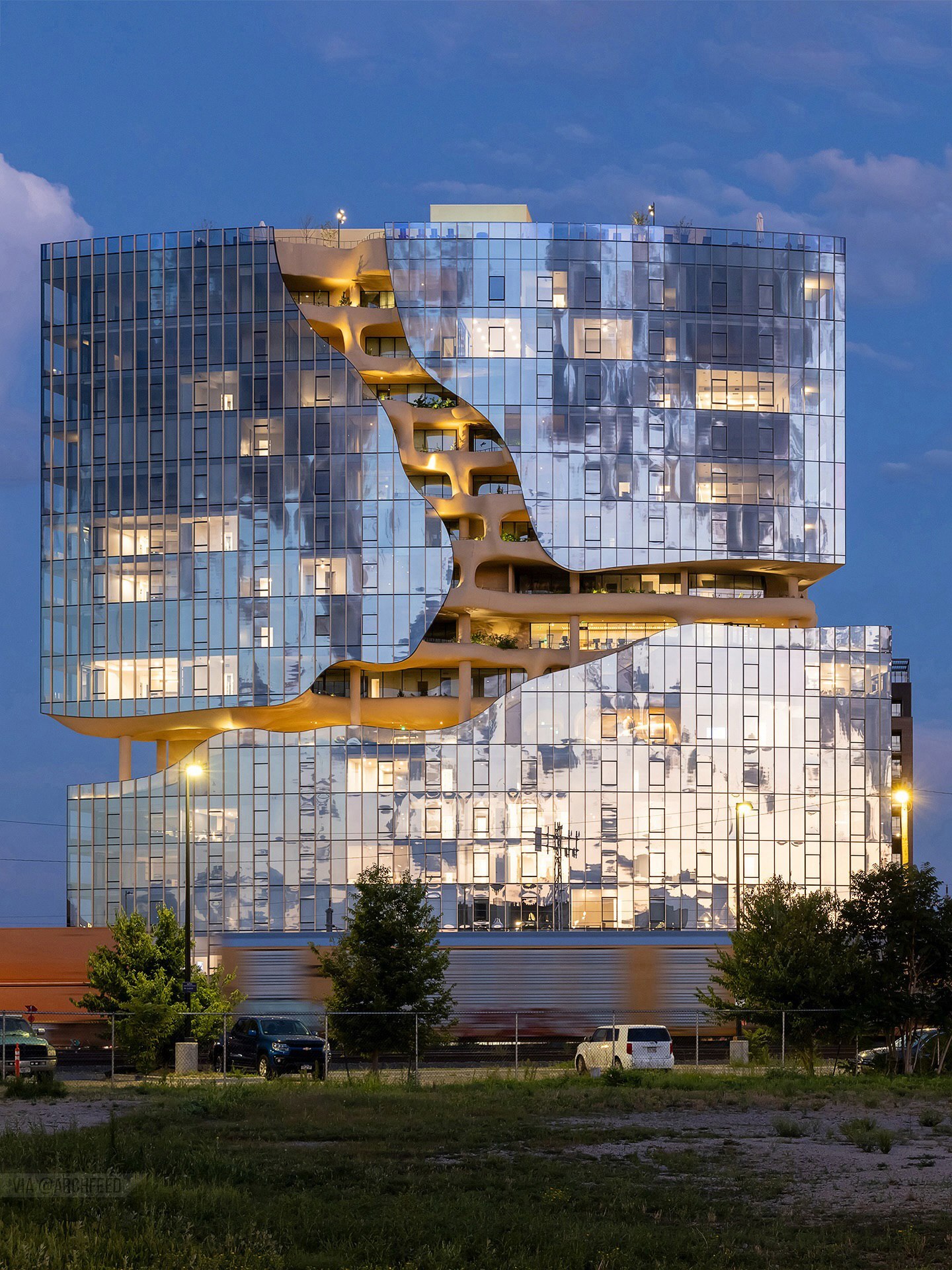 گروه معماری MAD از پروژه «وان ریور نورث» در کلرادو رونمایی کرد. این ساختمان ۱۶ طبقه با شکافی به شکل درههای طبیعی یا حتی شبیه به استخوان در نمای شیشهای، تجربه زندگی در میان صخرهها و آبشارها را برای شهروندان دنور فراهم کرده و مرزهای معماری مدرن را تغییر داده است. چیزی شبیه ترکیب استخوان با نورهایی که نماد روشنایی و امید است.