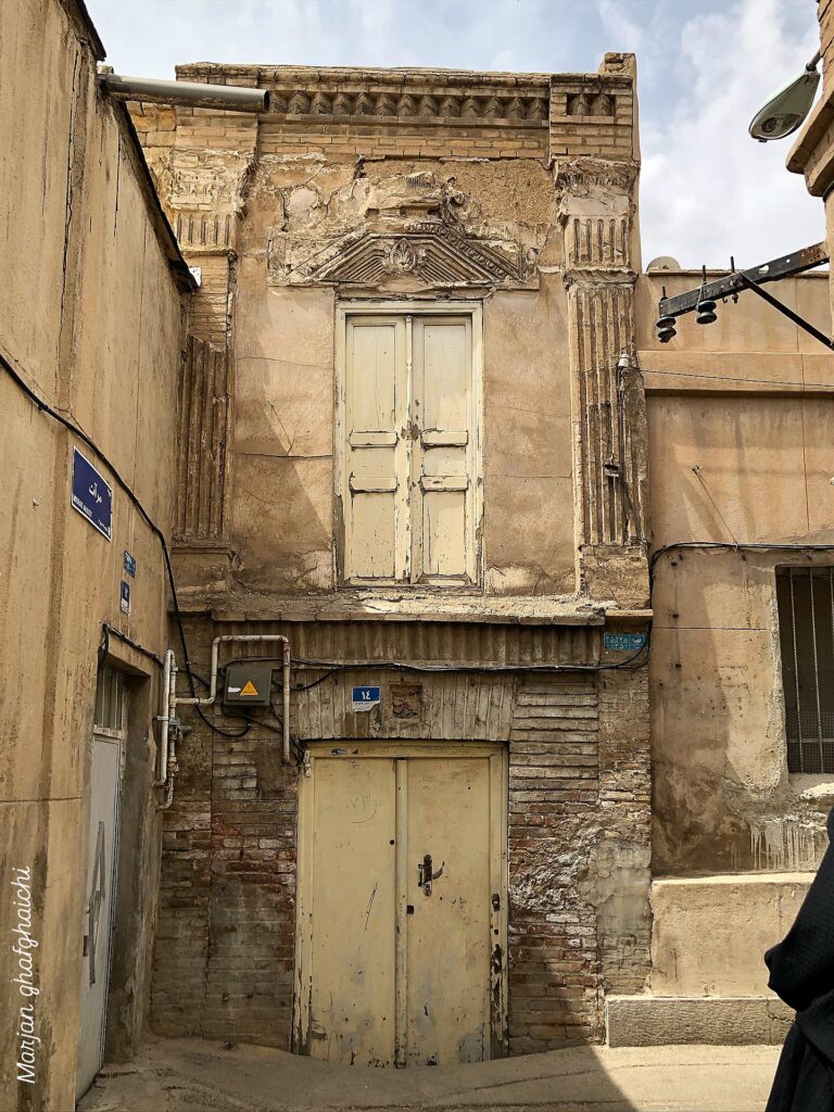 این خانه از نظر مختصات معماری، نمونهای از بافت مسکونی تاریخی در اقلیم گرم و خشک شهری است؛ جایی که عرض کم معبر، دیوارهای ضخیم آجری و سطوح اندودشده، پاسخ مستقیم به شرایط اقلیمی و اجتماعی زمان ساختاند. ترکیب آجر، گچ و تزئینات فرسودهی سردر نشان میدهد بنا احتمالاً متعلق به اواخر دوره قاجار یا اوایل پهلوی است؛ دورانی که الگوهای کلاسیک سادهشده با مصالح بومی در خانههای شهری رواج داشت. تناسب عمودی نما، تقارن نسبی و تأکید بر محور میانی، به بنا وقار و هویت میدهد؛ هرچند فرسایش و الحاقات معاصر، خوانایی اولیهی آن را تا حدی مخدوش کرده است.