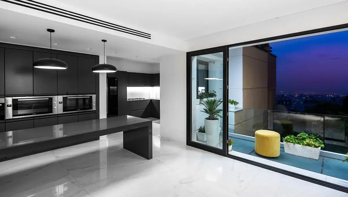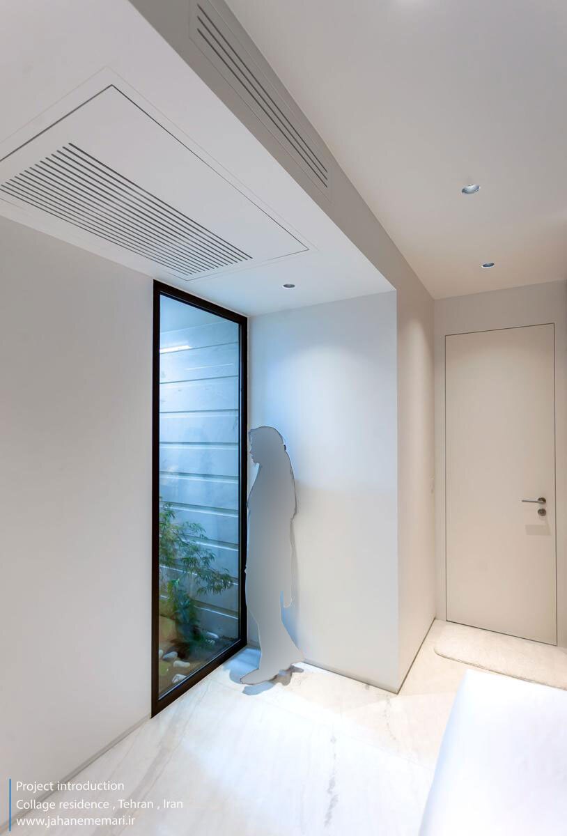 همچنین با باز شدن این مانع، چشمانداز بیرون و نور روز در اختیار فضای نشیمن و آشپزخانه قرار میگیرد. نورگیر جبههی شمالی آپارتمان جای خود را به یک حیاط خلوت کوچک داده است. گیاهان این فضا را سبز کردهاند و دو اتاق مجاور آن روشنایی خود را از آن میگیرند.