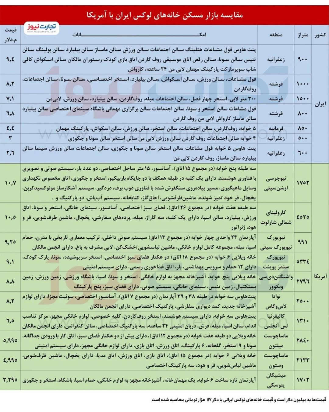 قیمت خانههای لوکس تهران به حدی از گرانی رسیده که با همان بودجه و یا حتی کمتر از آن میتوان در آمریکا ملکهایی چند هزار متری با تجهیزات کامل و خدمات رفاهی منحصر به فرد خریداری کرد.