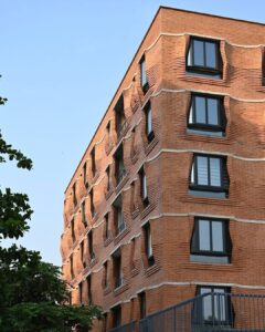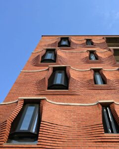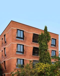 ویژگی بارز این پروژه، پوسته خارجی آن است که از دیوارهای آجری و سیستمهای حفاظتی در برابر تابش خورشید تشکیل شده است. معماران پروژه با همکاری استادکاران آجرچین از منطقه پوندیچری در جنوب هند، سیستمی را طراحی کردند که در آن دیوارهای آجری با ضخامت ۲۳ سانتیمتر (۹ اینچ) به صورت «پیشآمده» اجرا شدهاند تا بار سردرهای سنگی و سایهبانها را تحمل کنند.