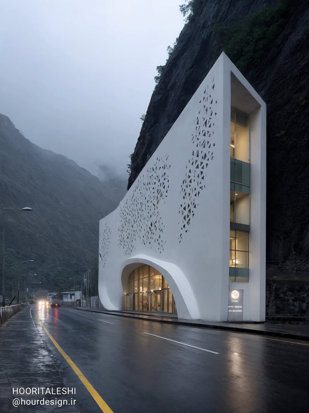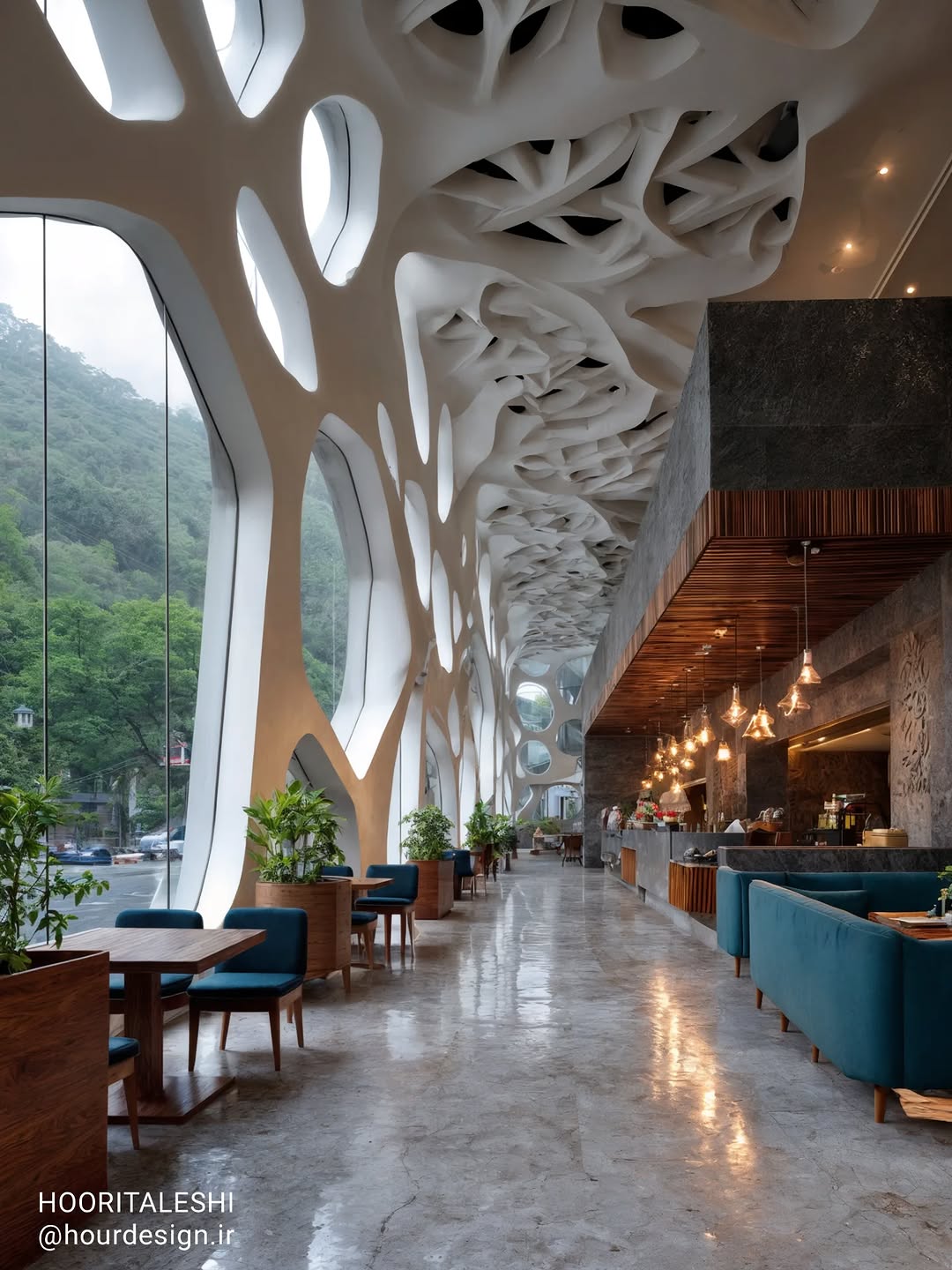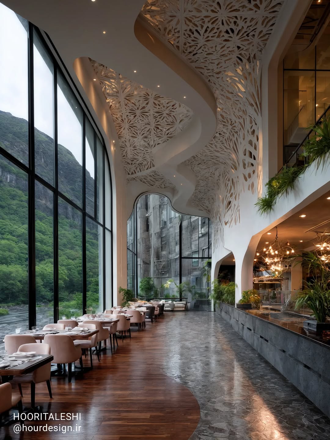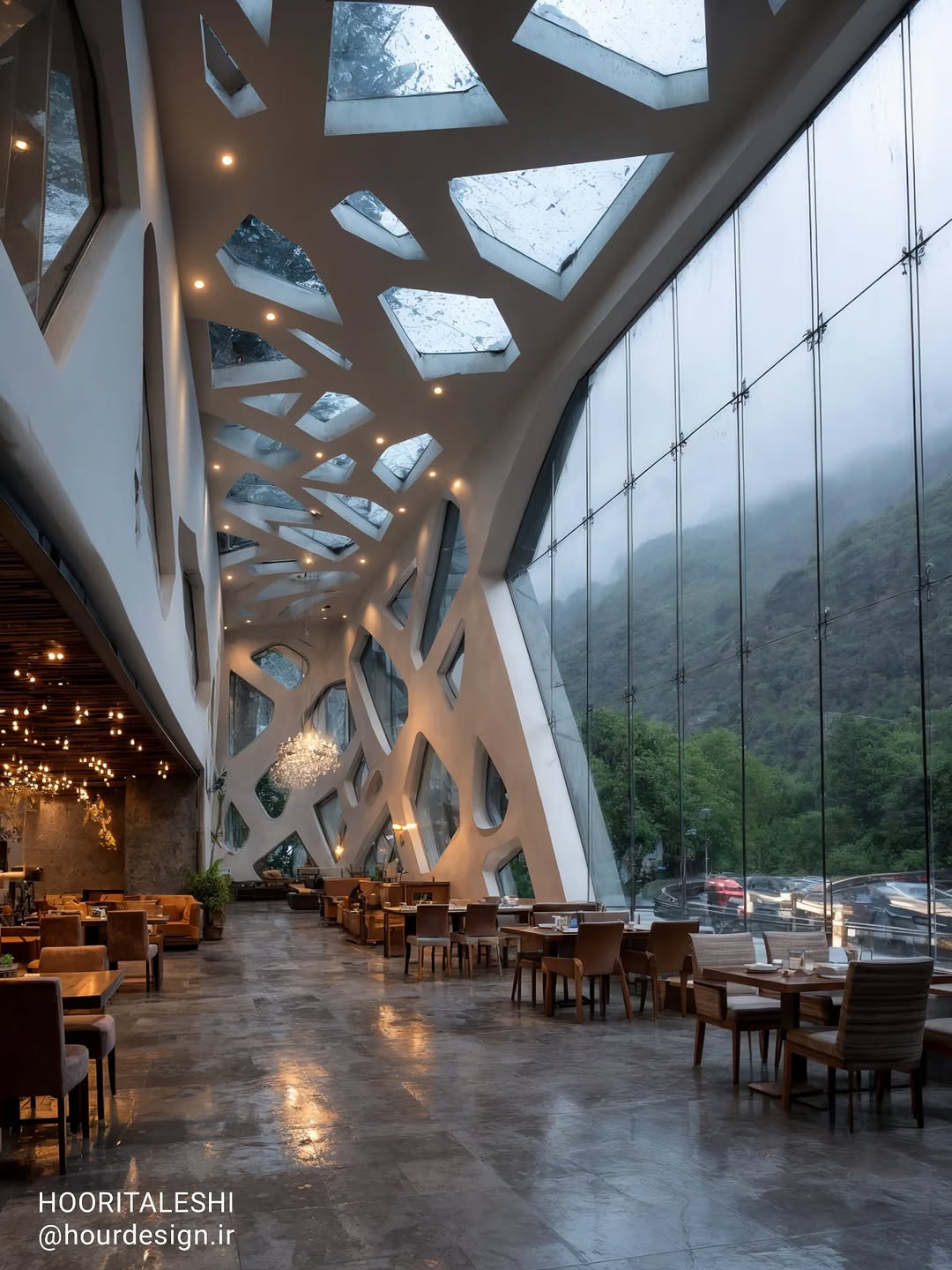 پوستهی سفید و مشبک ساختمان، تنها یک پوشش معماری نیست، بلکه چون فیلتری هنرمندانه، نور را از میان الگوهای ارگانیک عبور میدهد تا بازی سایه و روشنایی، لحظهی حضور در رستوران را به تجربهای شاعرانه و آرامشبخش تبدیل کند.