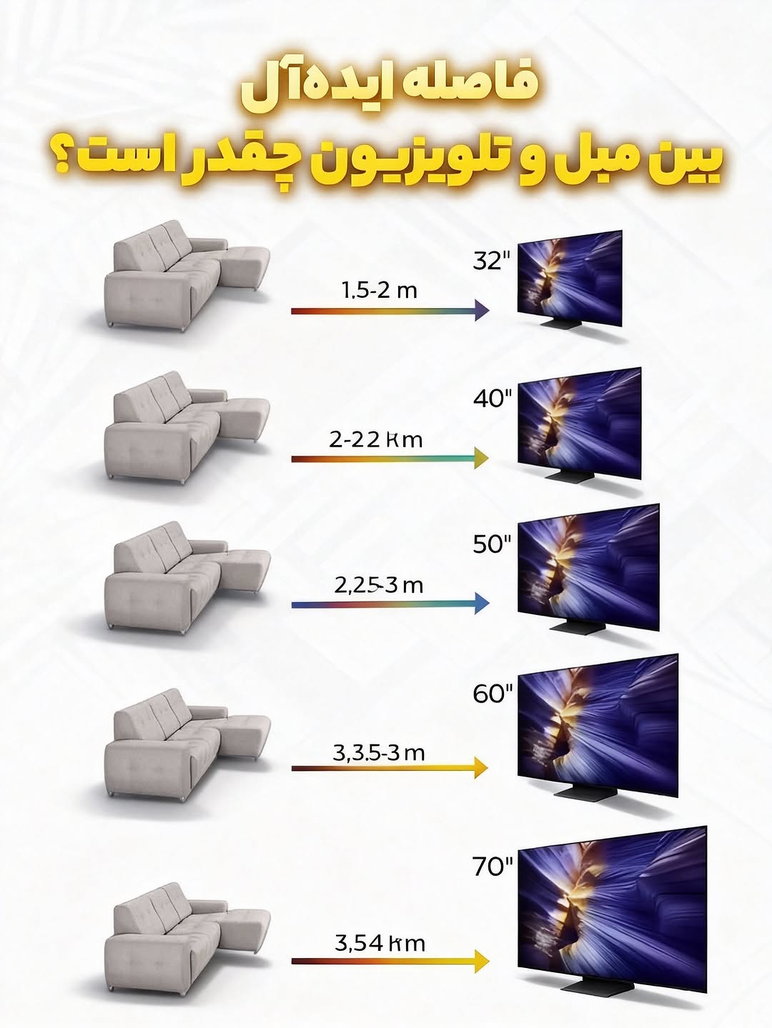 در این مطلب به این موضوع میپردازیم که چطور با توجه به اندازه تلویزیون، بهترین فاصله را انتخاب کنیم تا هم چشم در آرامش باشد و هم چیدمان نشیمن ظاهری زیبا و حرفهای پیدا کند.