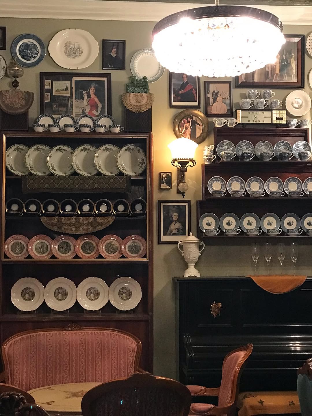 فضای داخلی این خانه، حالوهوایی نوستالژیک و چشمنواز دارد؛ دیوارها پوشیده از قابها و بشقابهای قدیمی است که مانند تکههایی از یک داستان بزرگتر کنار هم قرار گرفتهاند. آیینهی سنتی با لبههای منحنی، نور گرم چراغهای دیواری را چند برابر کرده و کنار صندلیهای سبز مخملی، حالتی شاعرانه و دلنشین ایجاد کرده است. بوفهی چوبی قدیمی با کتابها، کارتپستالها و اشیای نوستالژیک، فضای کافه را درست شبیه نشستن در اتاق خاطرات یک هنرمند میکند.