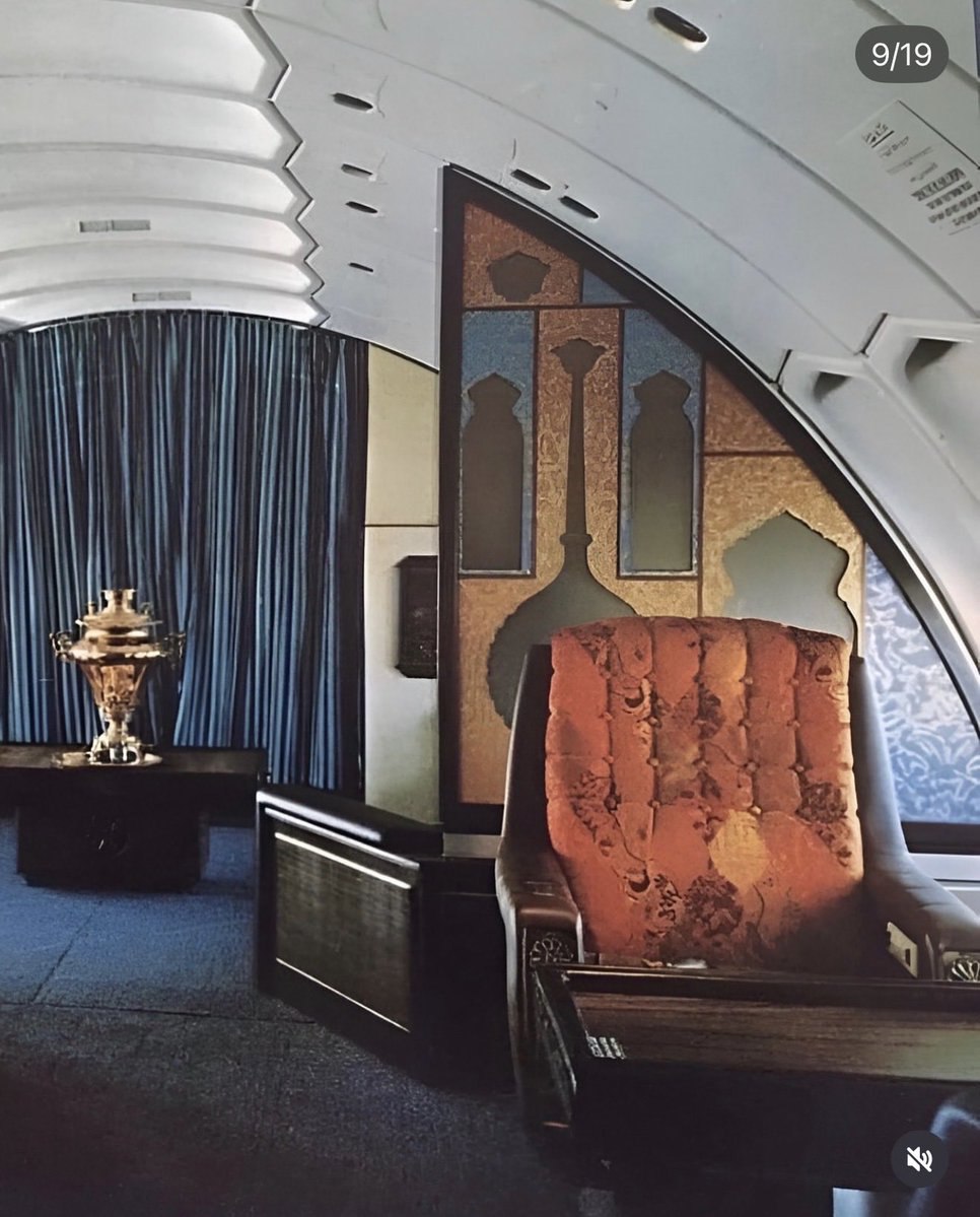 صندلیهای مخملی با نقشهای سنتی، پردههای سنگین آبی، و دیواری الهامگرفته از معماری ایرانی، فضایی پرشکوه آفریدهاند. در دوردست، سماوری طلایی روی میز میدرخشد؛ نمادی از مهماننوازی ایرانی، درست در قلب مدرنترین هواپیمای آن دوران.