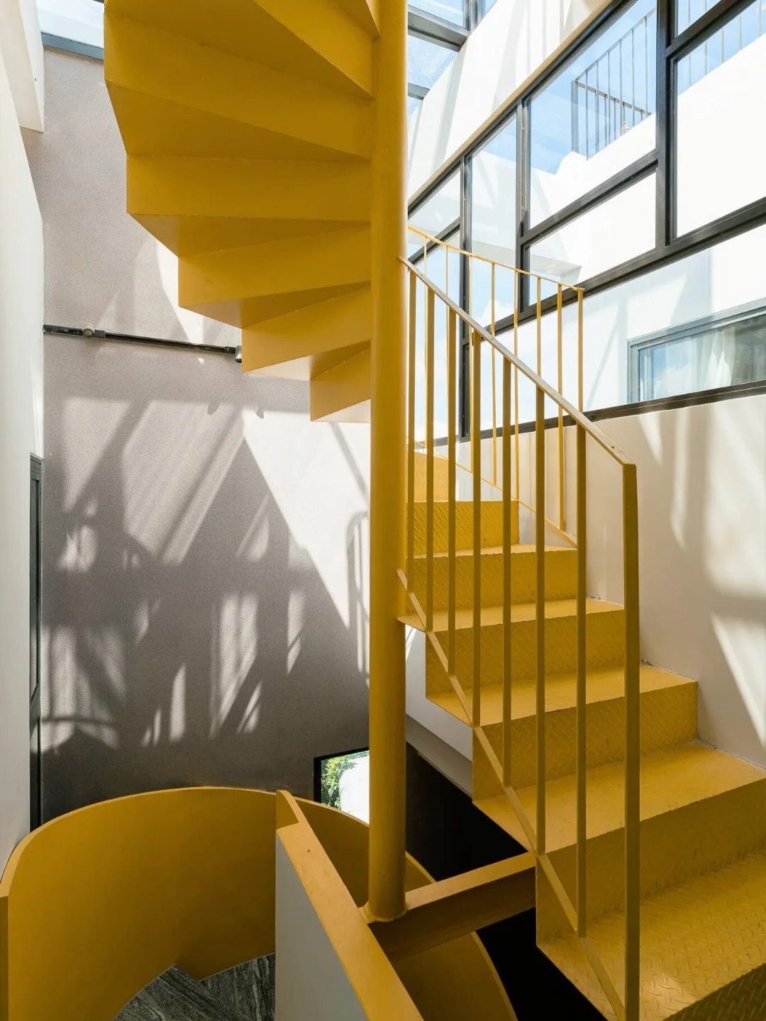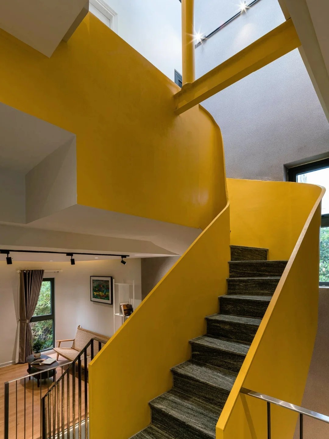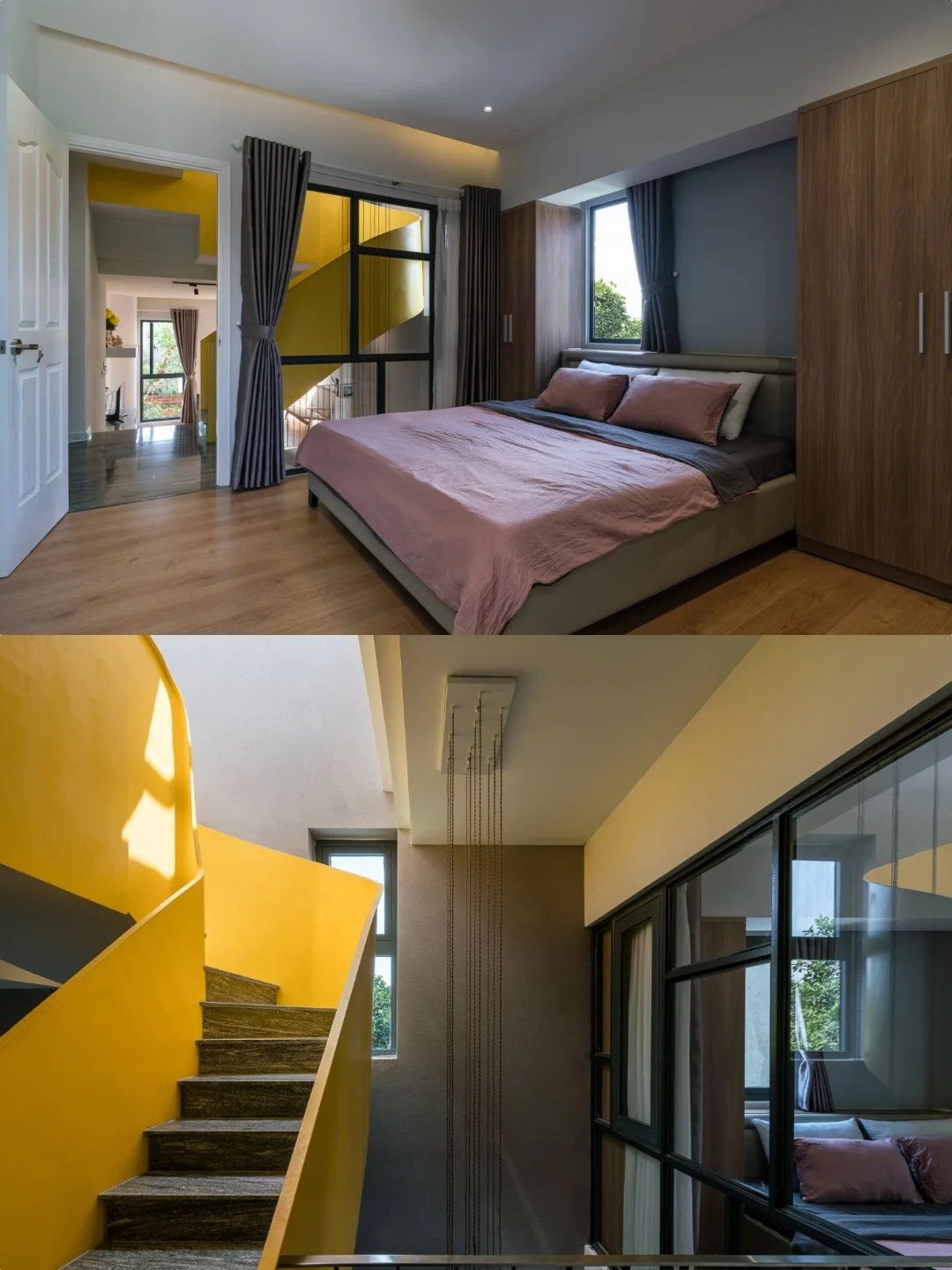 در راستای بهینهسازی فضا و نور، این پروژه از یک طراحی هوشمندانه با سطوح جابهجا شده استفاده کرده است. محوطه پلهها تبدیل به یک نورگیر عمودی بزرگ شده که اجازه میدهد نور طبیعی و تهویه به عمق تمامی طبقات نفوذ کند و علیرغم متراژ کوچک خانه، احساس بزرگی و گستردگی را القا کند.