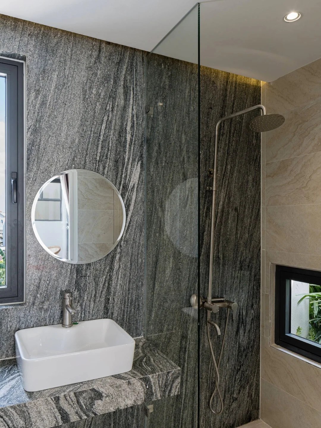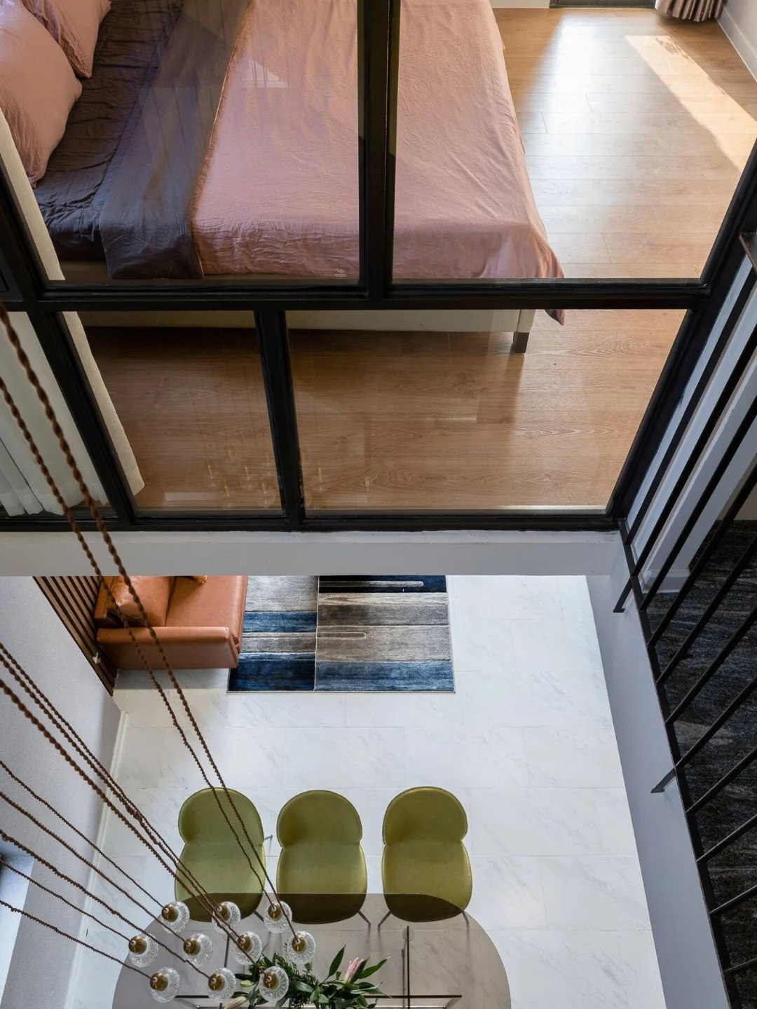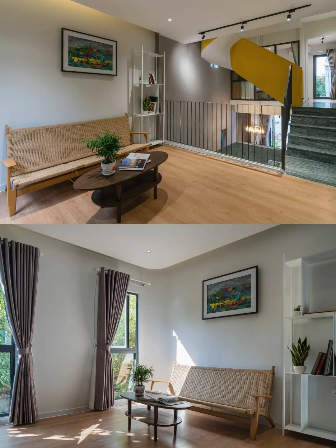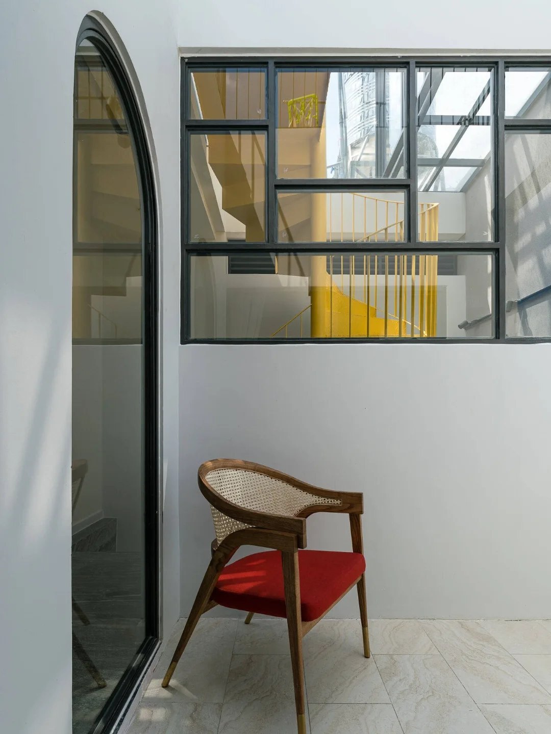 در راستای بهینهسازی فضا و نور، این پروژه از یک طراحی هوشمندانه با سطوح جابهجا شده استفاده کرده است. محوطه پلهها تبدیل به یک نورگیر عمودی بزرگ شده که اجازه میدهد نور طبیعی و تهویه به عمق تمامی طبقات نفوذ کند و علیرغم متراژ کوچک خانه، احساس بزرگی و گستردگی را القا کند.