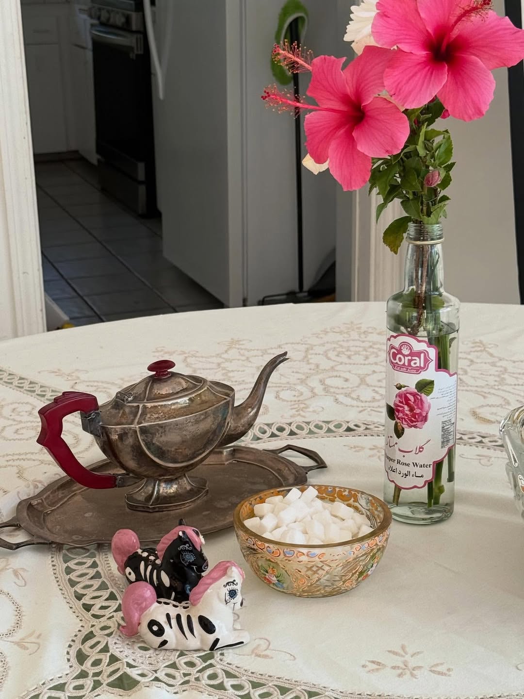 در این عکس، یک فرش ایرانی نفیس با طرحی اصیل، قلب دکوراسیون خانه را تشکیل میدهد و فضایی گرم و سنتی ایجاد کرده است. جزئیات خانه پر از المانهای فرهنگی ایرانی است: یک قوری سنتی ایرانی روی میز، شیشههای گلاب خوشعطر، بستههای تافی مینو که نوستالژی دوران کودکی را یادآوری میکنند، تخته نرد به عنوان یک بازی سنتی و حتی یک روزنامه قدیمی ایرانی که حس تاریخ و فرهنگ را منتقل میکند.