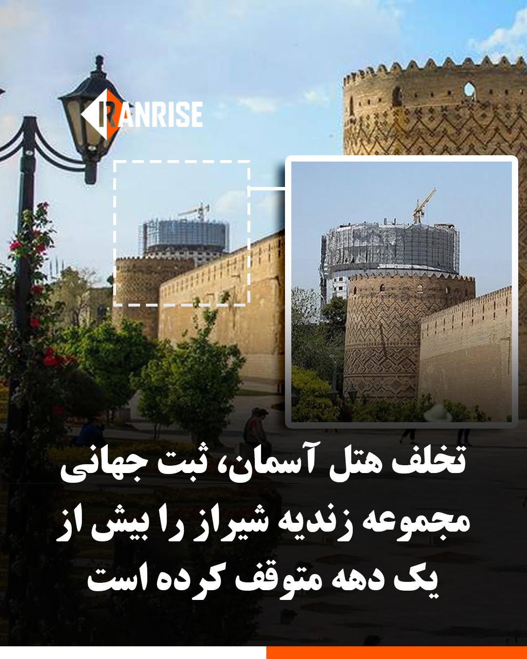 سیاوش آریا، پژوهشگر تاریخ و کنشگر میراث فرهنگی، در گفتوگو با ایلنا توضیح داد که هتل آسمان در خیابان رودکی شیراز با بلندمرتبهسازی غیرقانونی و افزودن چهار اشکوبه مازاد، چشمانداز تاریخی ارگ کریمخانی را مخدوش کرده است. او یادآور شد که با حکم دادستانی تنها دو طبقه برچیده شد و دو اشکوبه باقیمانده همچنان پابرجاست.