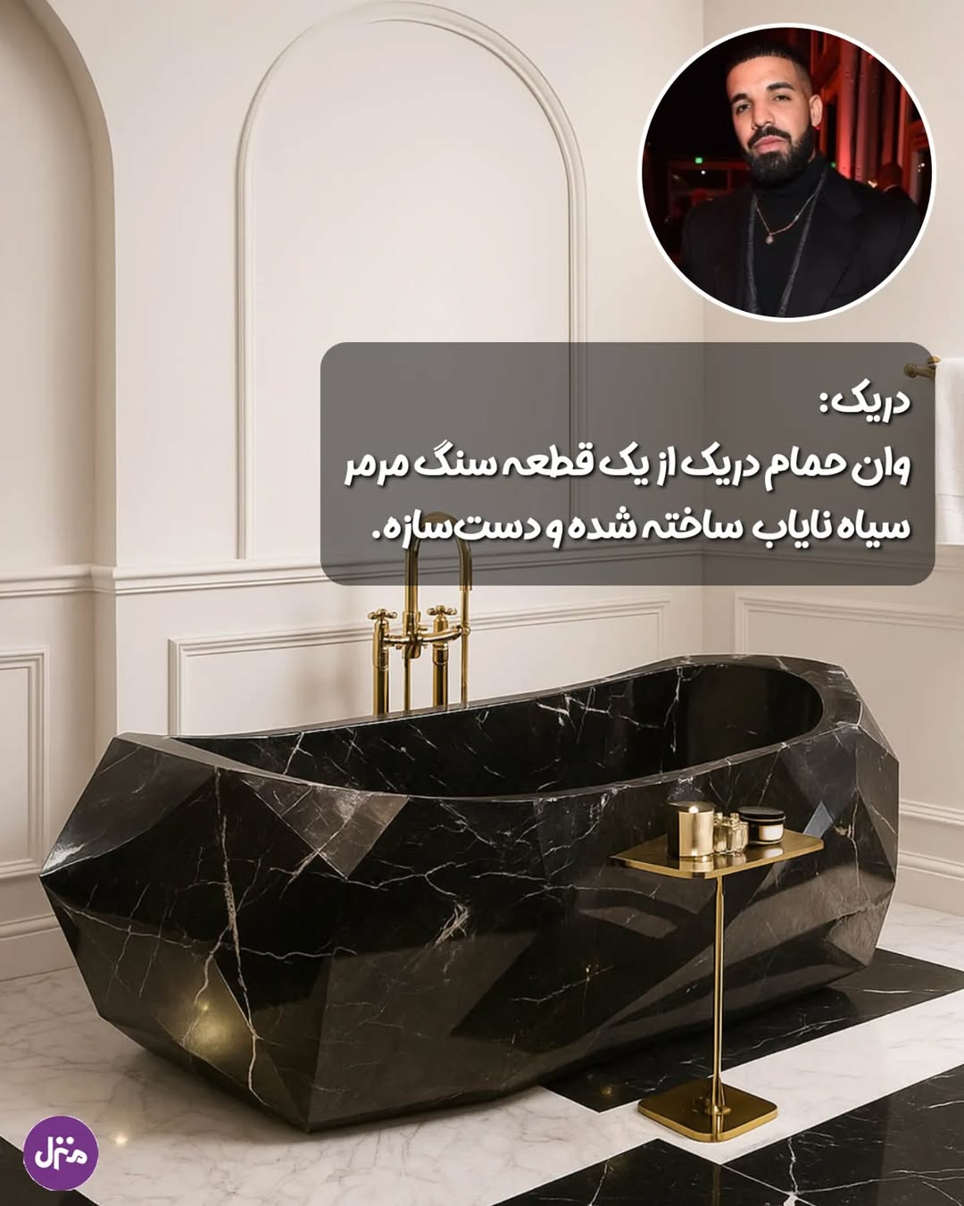اما دریک با وان مرمر سیاه خود رکورد خاصپسندی را شکسته! این وان از سنگ مرمر سیاه کمیاب ساخته شده و گفته میشود خودش ۴۰۰ هزار دلار (حدود ۴۲ میلیارد تومان) برای آن پرداخت کرده و حتی تراش آن بهصورت دستی توسط هنرمندان خاص انجام شده است.