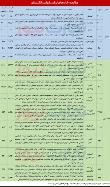 به این ترتیب، حتی گرانترین املاک در کلانشهرهای انگلستان قیمت به مراتب کمتری نسبت به واحدهای لاکچری در تهران دارند و امکانات و کیفیت ساخت خانههای لوکس تهران اصولا قابل قیاس با نمونههای مشابه در انگلستان نیست. سطح رفاه، خدمات شهری و استانداردهای زندگی در دو کشور نیز تفاوت چشمگیری دارند و بعضا غیرقابل توصیف هستند.