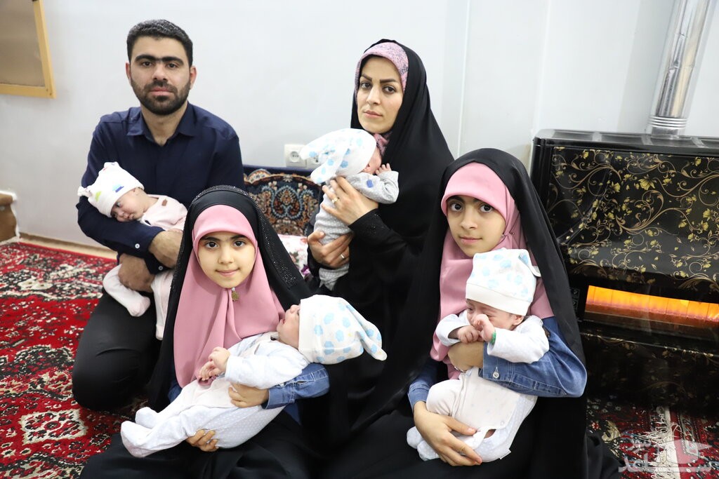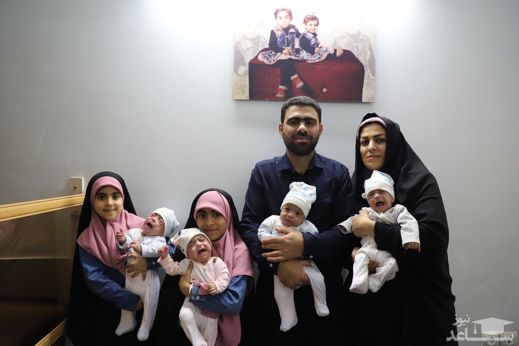 یکی از بچه ها را در بغلش نگه داشته و تکان تکان می دهد تا آرام شود و بخوابد. همزمان چشمش به مادر و دخترهاست که مشغول رسیدگی به بچه های دیگر هستند. وسط صدای گریه و نق زدن بچه ها می گوید: «من قبل از تولد بچه ها، 2فرزند داشتم، طهورا و آتنا، دختران 11ساله و 9ساله ام. خدا لطفی در حق من و همسرم کرد و ما صاحب 4قلو شدیم.»