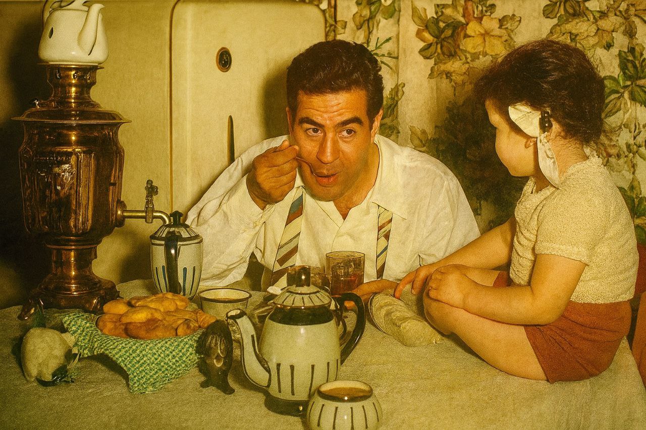 ناصر ملکمطیعی متولد 8 فروردین 1309 بازیگر و کارگردان سرشناس سینمای ایران پیش از انقلاب ۱۳۵۷ بود؛ هنرمندی که مانند همدورهایهایش، محمدعلی فردین و بهروز وثوقی، پس از انقلاب امکان ادامه فعالیت گسترده هنری را پیدا نکرد و تنها در دو فیلم حضور داشت. تصویری قدیمی از او حالوهوای زندگی گرم و صمیمی آن دوران را بازتاب میدهد:آشپزخانهای با سماور برنجی براق، سرویس چایخوری طرحدار، پردههای گلدار و یخچال قدیمی؛ دکوری که تماماً نشانههای یک خانه ایرانی پیش از انقلاب است. این صحنه در کنار دخترش، تصویری کوتاه اما پر از نوستالژی از روزگاری ساده و صمیمی را زنده میکند.