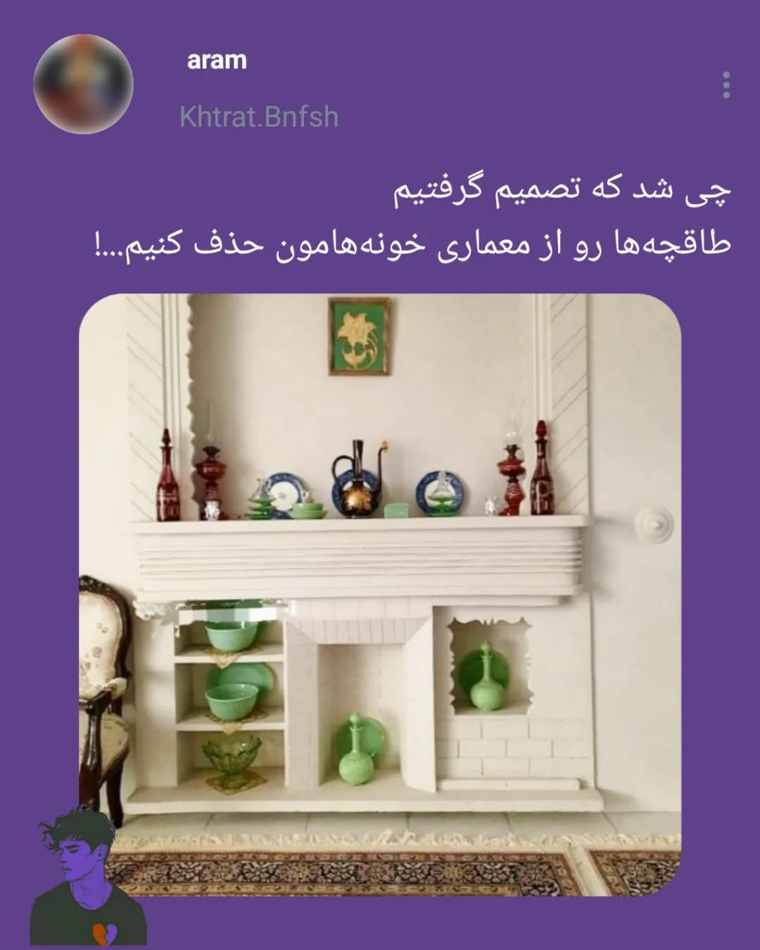 طاقچه فقط یک قفسه ساده نبود؛جایی بود برای قرار دادن کتابهای قدیمی، گلدانهای سفالی، شمعدانهای برنجی، قرآنهای جلد چرمی، یادگاریهای خانوادگی و هر چیزی که حس زندگی و خاطره داشت.