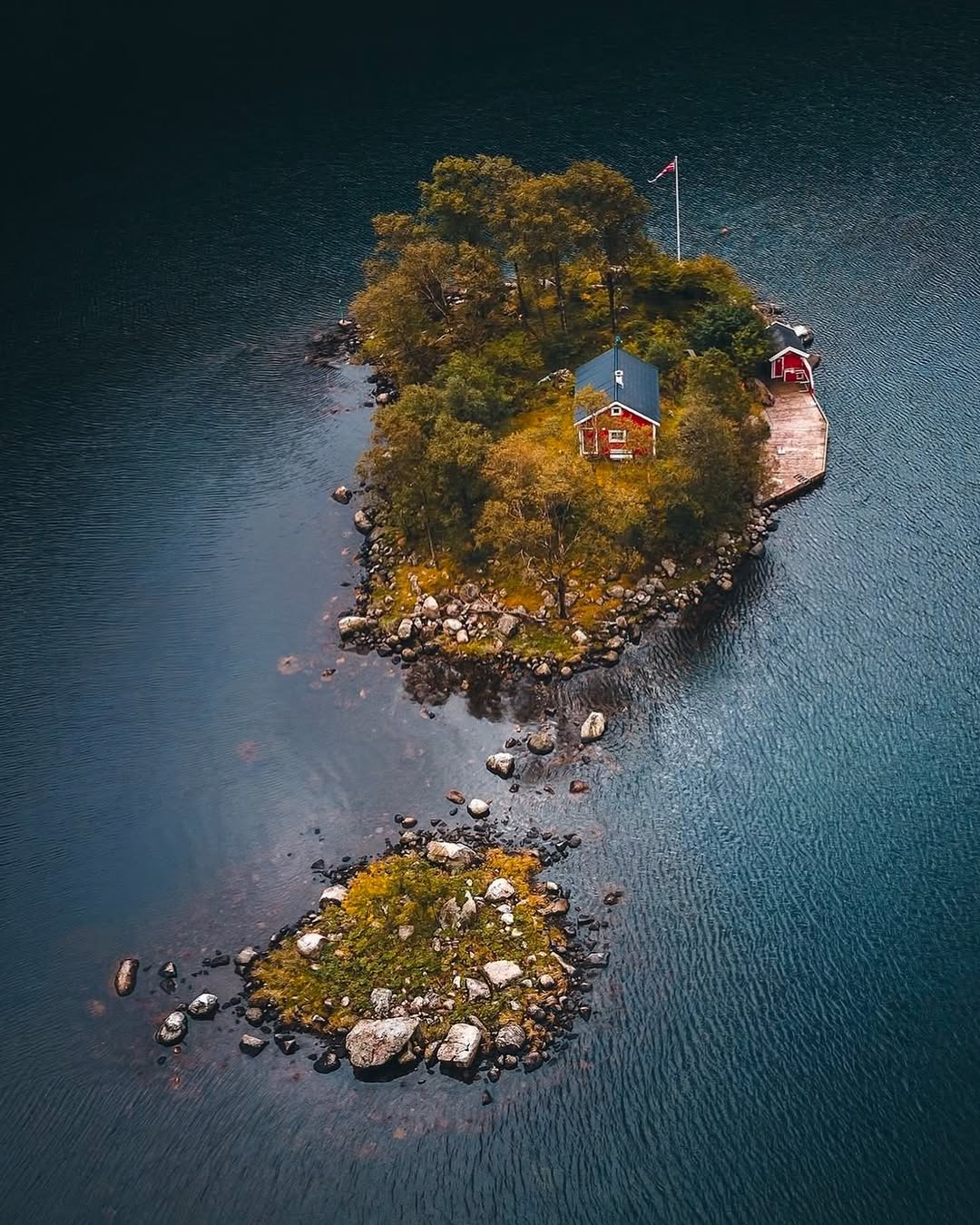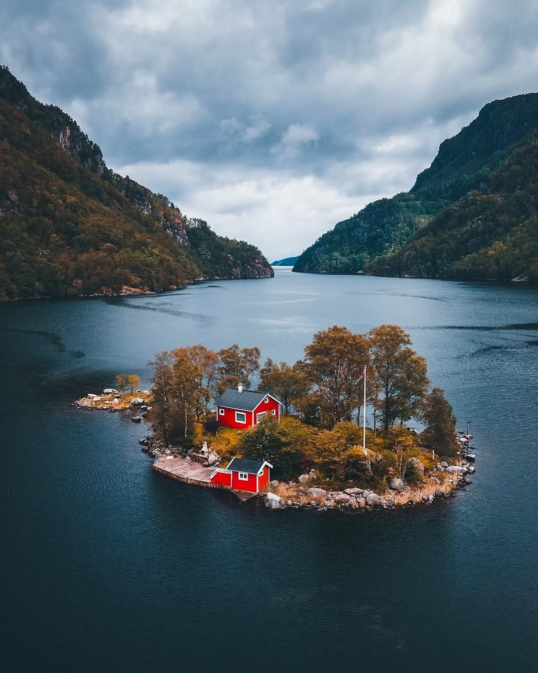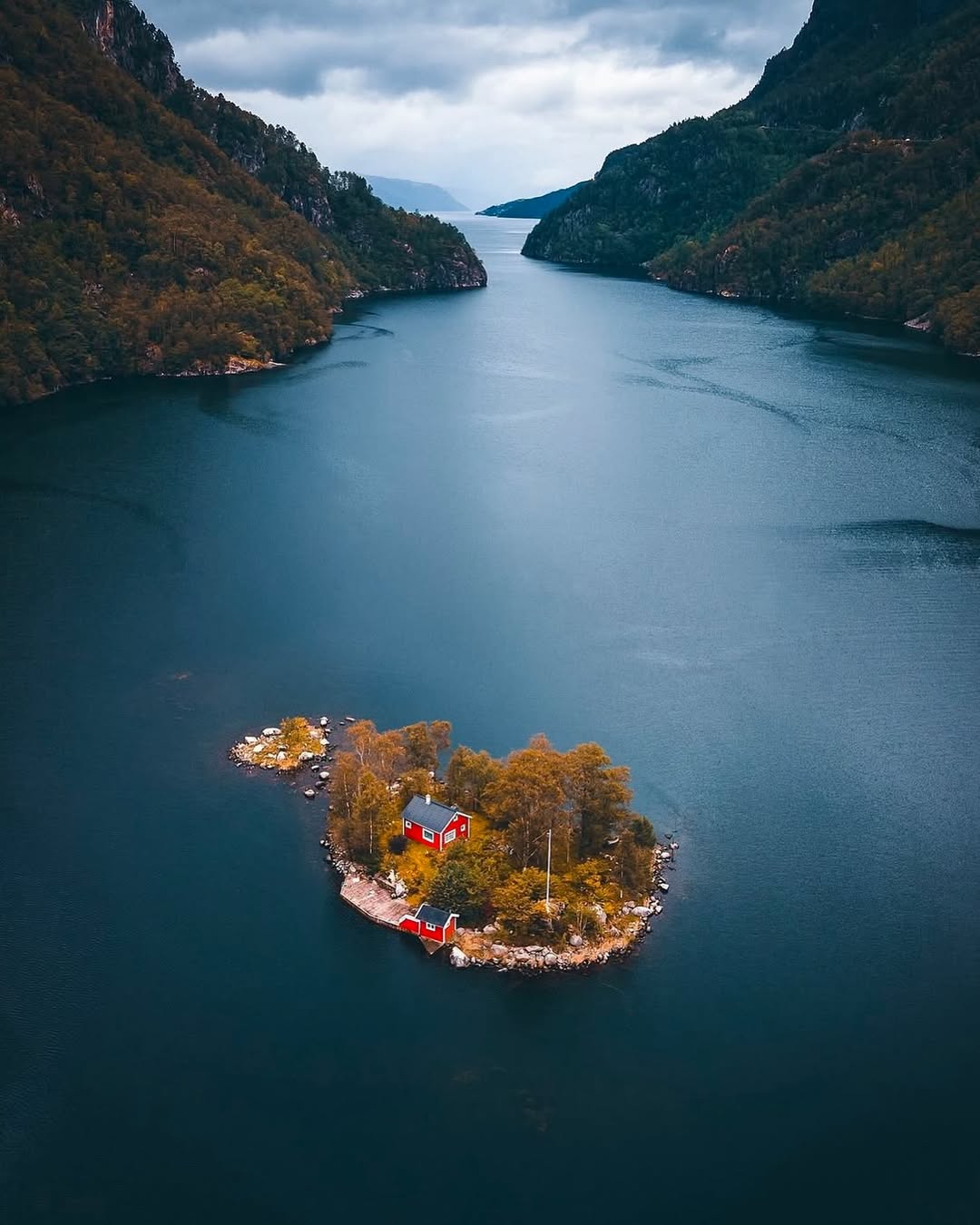 در میان آبهای آرام نروژ، خانهای کوچک و تنها با رنگ قرمز آشنای اسکاندیناویایی دیده میشود؛ جایی که انگار آگاهانه از جهان فاصله گرفته تا فقط با دریا، کوه و آسمان زندگی کند. احاطه شدن جزیره با آب، حس خلوت و امنیت را تقویت میکند؛ فضایی بیهمسایه و بیشتاب.