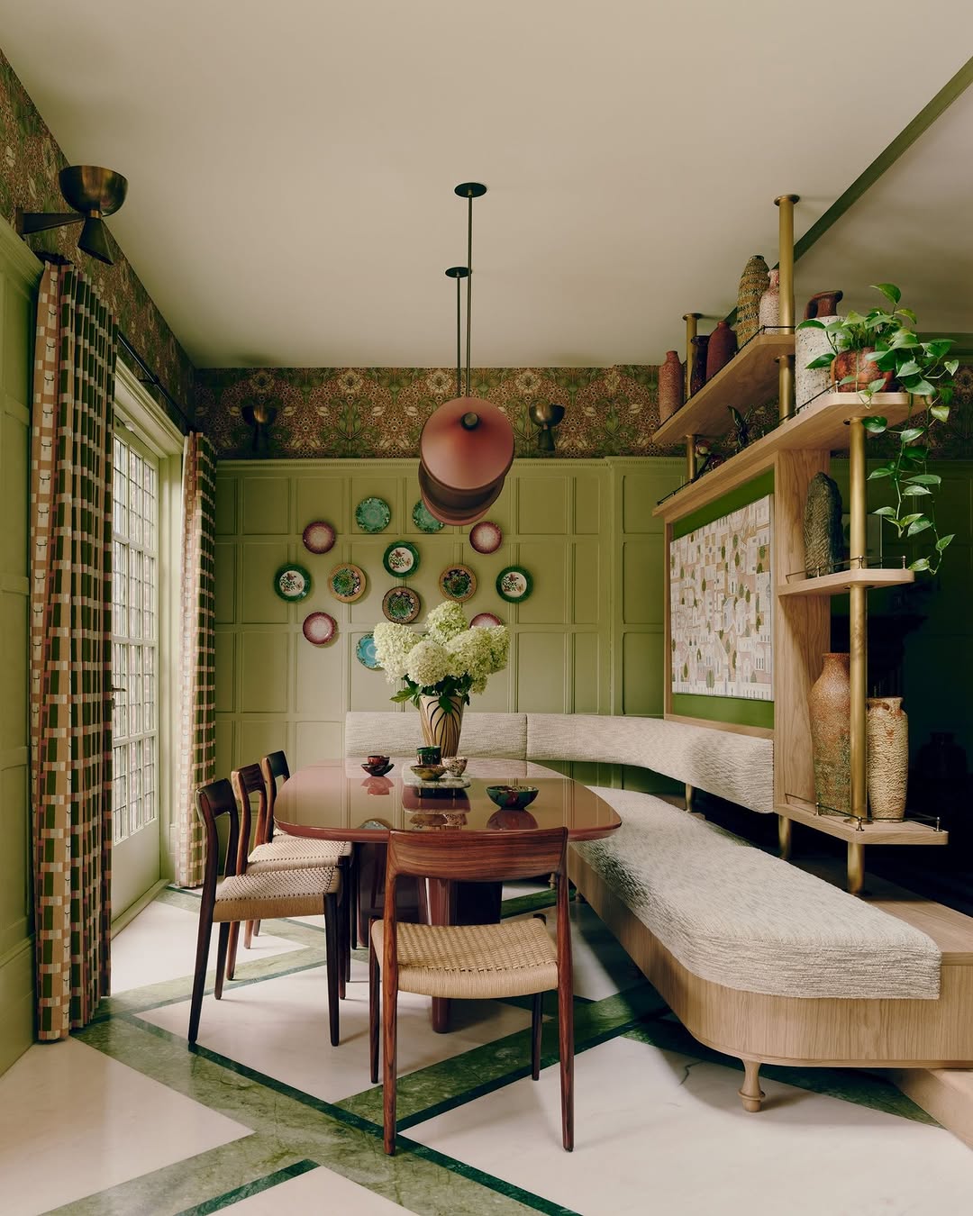 دیوارها و پانلهای چوبی تاریخی، با رنگهای پرنشاط و اشباع شده شسته شدهاند تا نشان دهند که چطور میتوان اصالت تاریخی را با روحی تازه و جسورانه ترکیب کرد. هر اتاق مانند یک شخصیت مستقل است، اما وقتی از یک فضا به فضای بعدی میرویم، جریان رنگها و فرمها بهطرزی نرم و طبیعی ما را همراهی میکند.