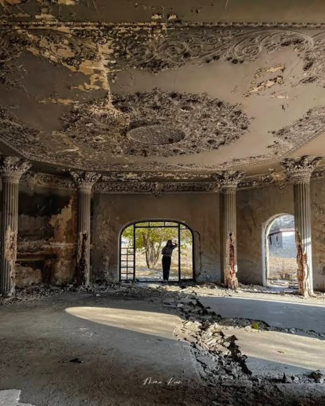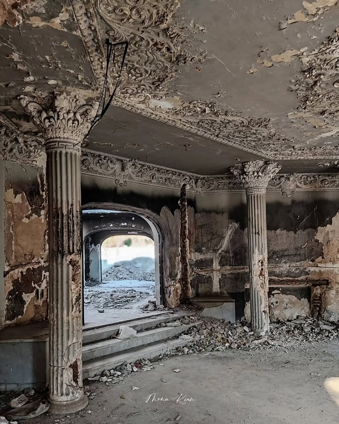 این بنا با وجود ویرانی و تخریب گستردهای که در تصاویر دیده میشود، نشانههایی از معماری باشکوه و جزئیات هنری ارزشمند را در خود حفظ کرده است. ستونهای بلند با سرستونهای تزیینشده به سبک کلاسیک، یادآور معماری الهامگرفته از الگوهای یونانی و رومی هستند. سقف دارای گچبریهای پرجزئیات و نقوش گیاهی و اسلیمی است که نشان میدهد در زمان ساخت، توجه ویژهای به زیبایی و ظرافت هنری بنا شده است. طاقها و قوسهای داخلی نیز به گونهای طراحی شدهاند که حس عمق و تقارن را به فضا میبخشند.