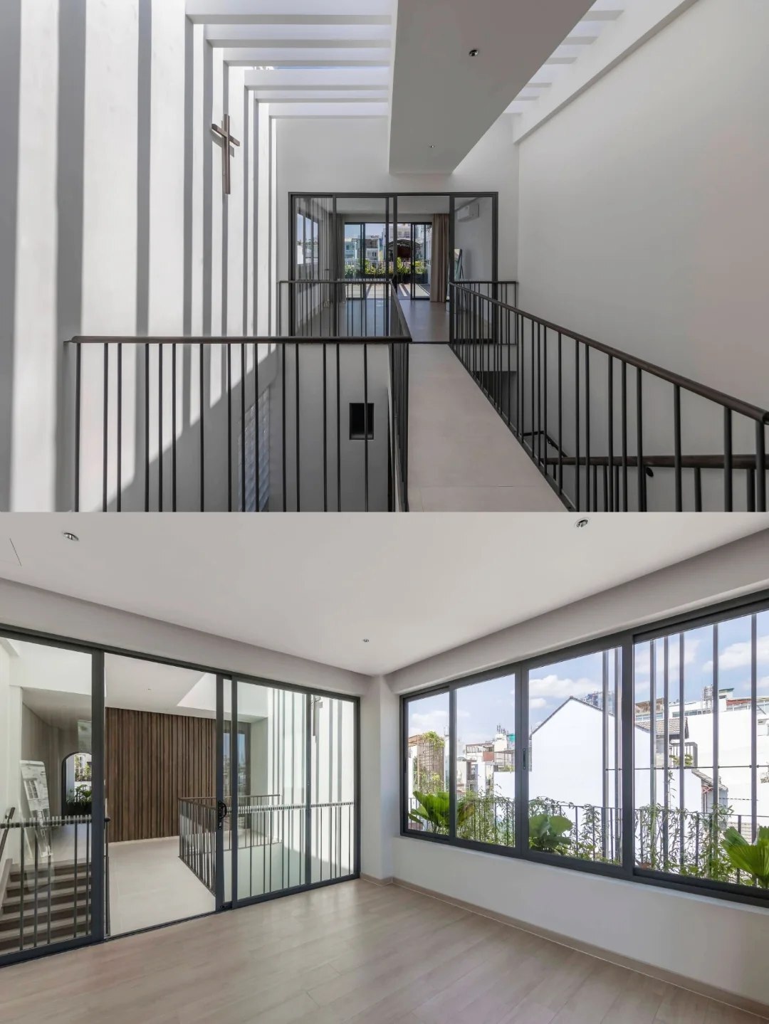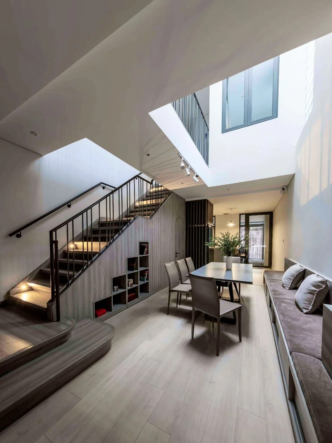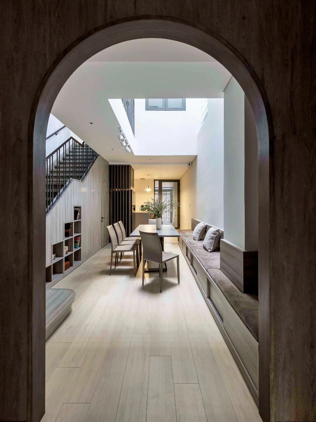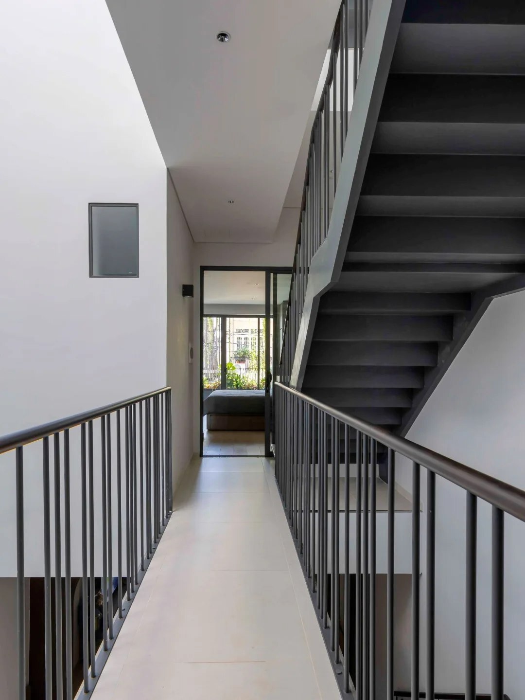 طراحی بر دهلیز مرکزی گستردهای متمرکز شده که تا چهار طبقه ارتفاع میگیرد. این عنصر نه تنها برای سرازیر شدن نور و هوای تازه به داخل خانه حیاتی است، بلکه نقطه اصلی ارتباط خانواده به شمار میرود؛ به طوری که فضای غذاخوری به شکلی استراتژیک زیر آن قرار گرفته تا تعاملات خانوادگی را تقویت کند. وحدت بصری این طرح با تکرار لایههای عمودی نما در نردهها و حفاظهای داخلی تضمین شده است. فضای داخلی، با سبکی مینیمالیستی و فضاهای سیال، تعادل میان ارتباط شدید مناطق مشترک و آسایش و حریم خصوصی کامل اتاقها را برقرار میکند.