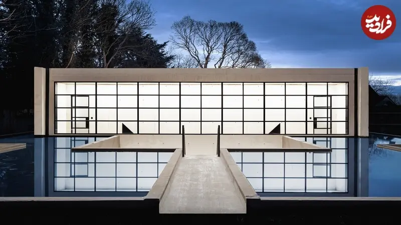 خانهای با دیوارهای شیشهای که دور تا دور سازه کشیده شدهاند. طراحی آن ساده و آرام است و در کنار یک انبار قدیمی قرار دارد.