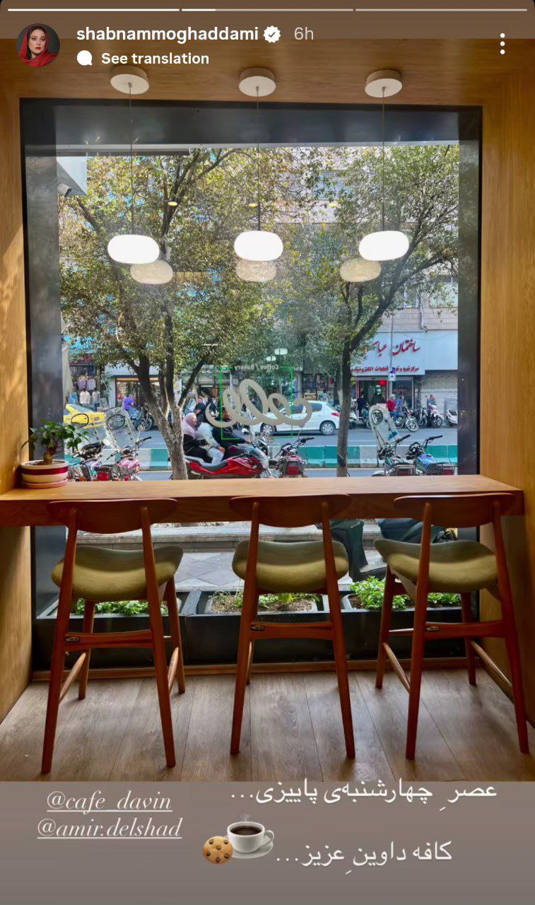 شبنم مقدمی بازیگر سینما خوش ذوق سینما و تلویزیون بهتازگی کافهای گرم و صمیمی را برای گذراندن اوقات فراغت و ثبت لحظههایی خاص انتخاب کرده.