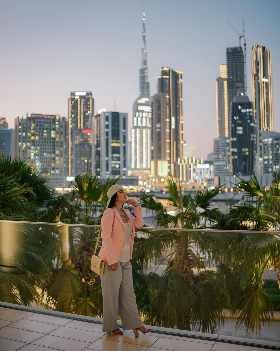 این عکس ها در فضایی لوکس و روباز گرفته شده که چشمانداز خیرهکنندهای از برجهای نورانی اطراف برج خلیفه را نشان میدهد.