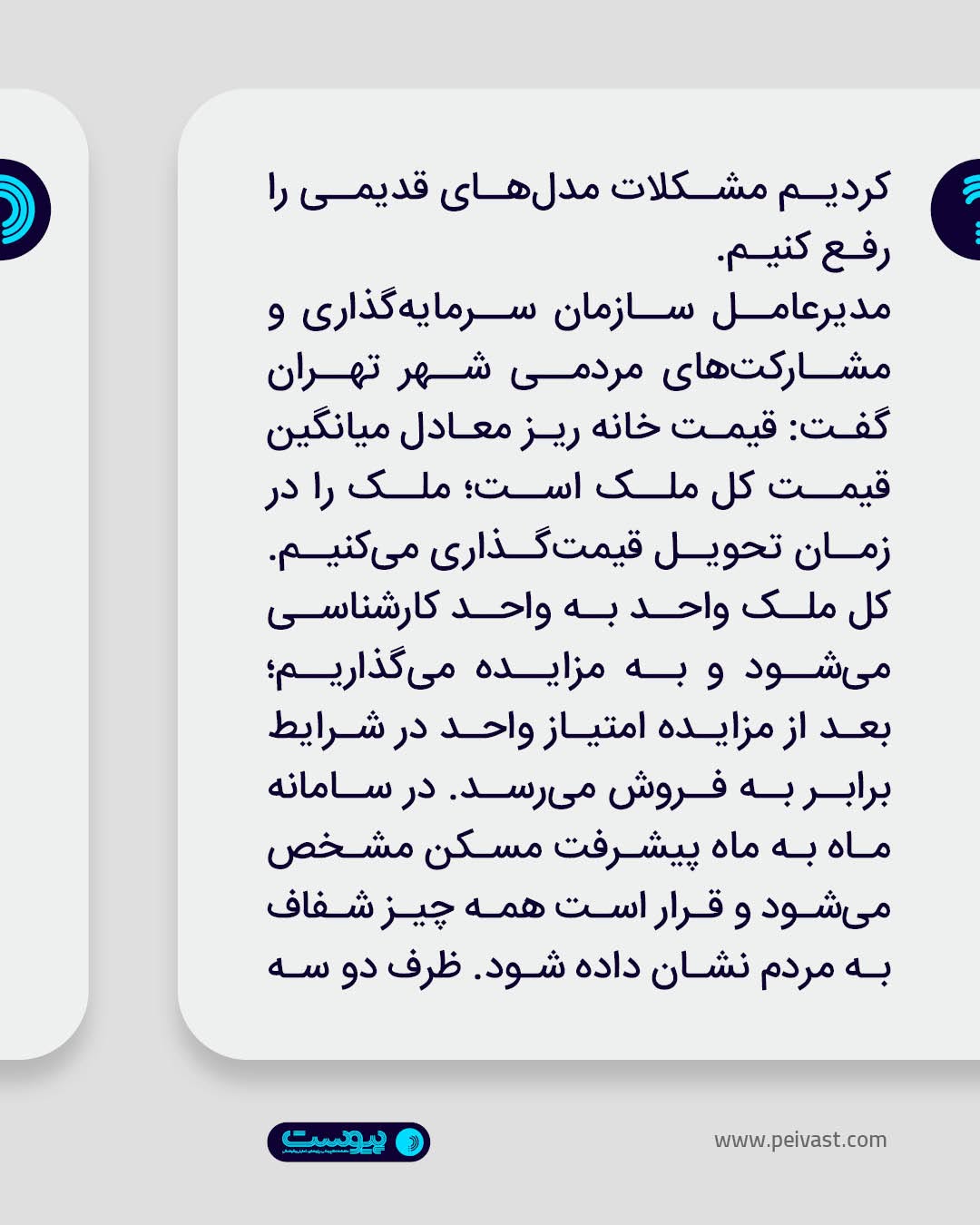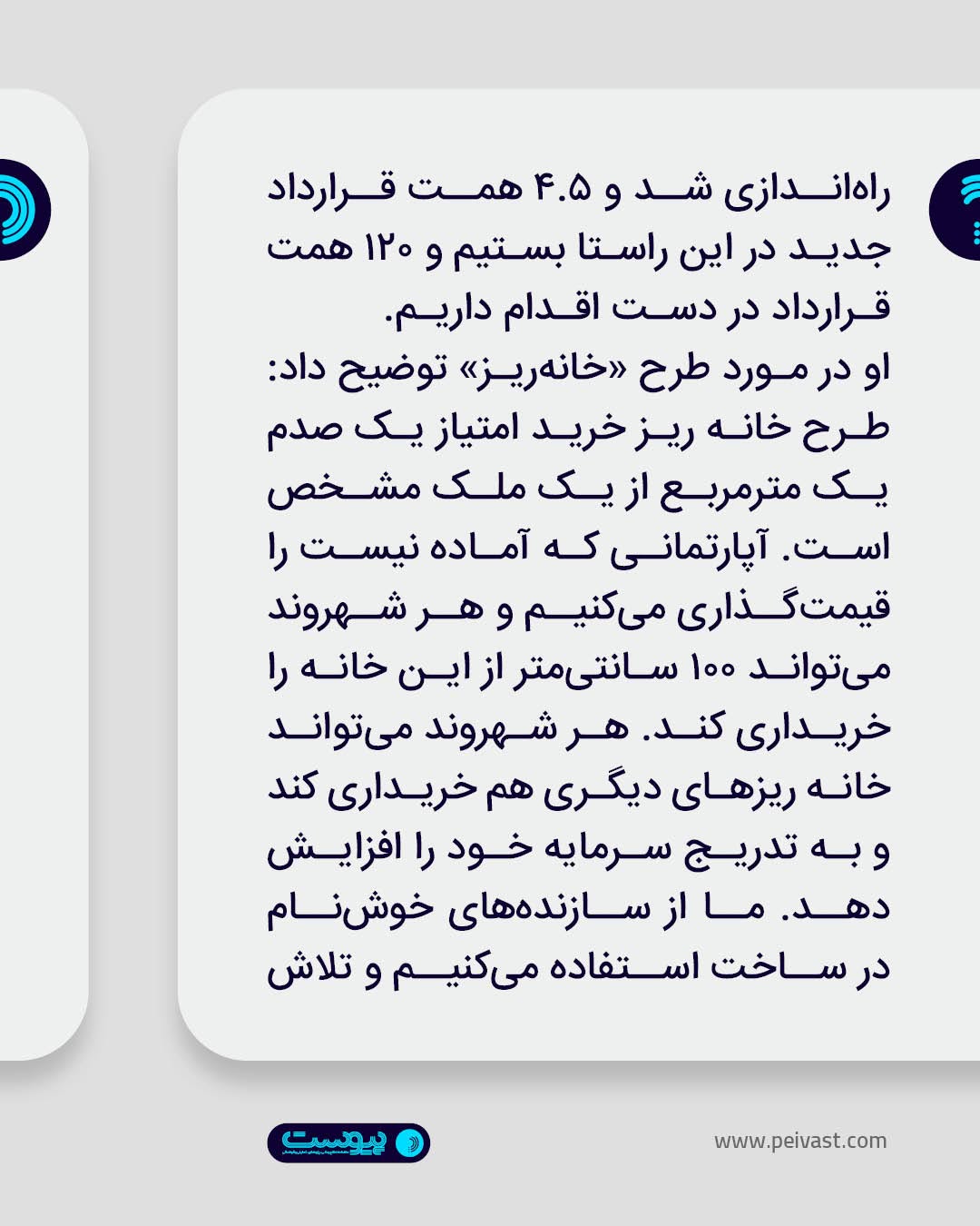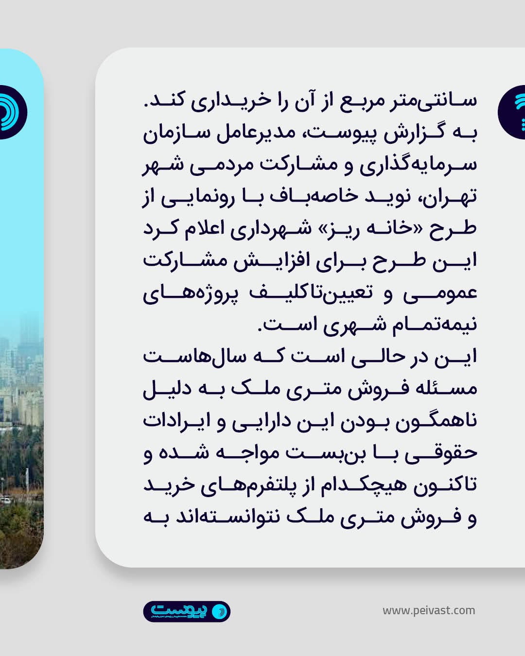 شهرداری تهران طرح «خانهریز» را با هدف سرمایهگذاری خرد و تعیینتکلیف پروژههای نیمهتمام شهری راهاندازی کرده است؛ در این طرح، ملکهای در حال ساخت قیمتگذاری میشوند و شهروندان میتوانند حداقل ۱۰۰ سانتیمتر مربع (یکصدم مترمربع) از یک واحد مشخص را بخرند.