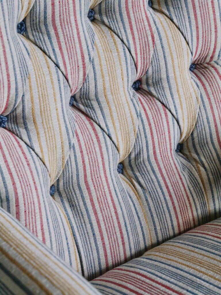 گتاهی زیبایی ظریف یک پارچه مبل میتواند به کل خانه آبرو بدهد؛ مینیمال، پیچیده و سه و ممتنع و البته تا ابد دلبر. از آن پارچهها که شاید کل یافتآباد و دلاوران هم نظیرش را نداشته باشند. طرح پارچهی این مبل ترکیبی دلنشین از ظرافت کلاسیک و گرمای سنتی است. خطوط راهراهی ملایم با طیفی از رنگهای خنثی و گرم کرم، بژ، آبی کمرنگ و رگههایی از قرمز ریتمی آرام و منظم ایجاد کردهاند که چشم را خسته نمیکند. این راهراهها نهتنها حس نظم و وقار میدهند، بلکه باعث میشوند مبل کشیدهتر و متعادلتر به نظر برسد؛ انتخابی هوشمندانه برای فضایی که قرار است آرامشبخش و صمیمی باشد.
