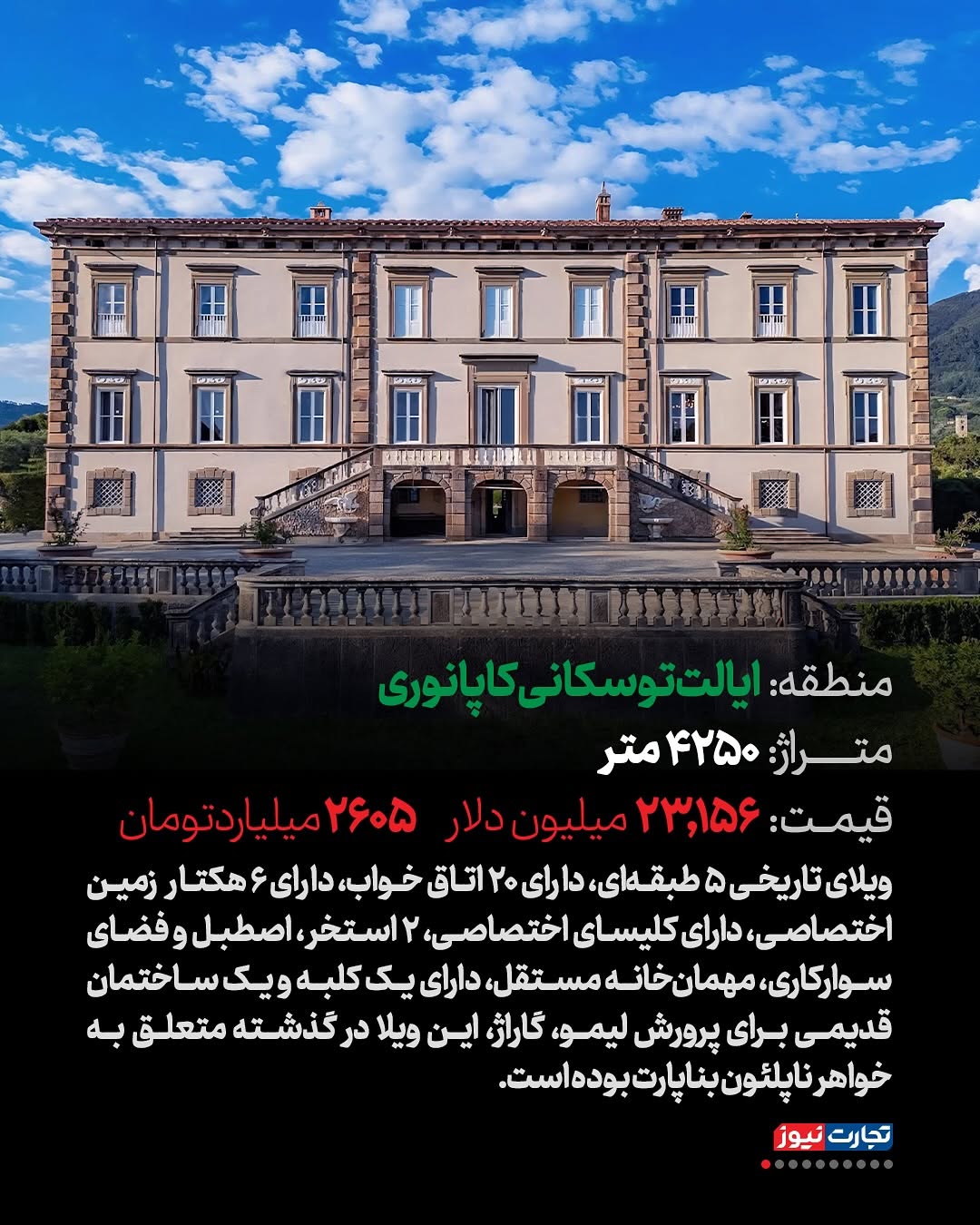 در مقابل در منطقه کاپانوری از ایالت توسکانی ایتالیا، ویلایی تاریخی با مساحت ۴۲۵۰ متر به قیمت ۲۳ میلیون و ۱۵۶ هزار دلار به فروش میرسد؛ ارزش ریالی این عمارت، بر اساس نرخ لحظهای دلار در زمان تنظیم این گزارش، حدود ۲۶۰۵ میلیارد تومان برآورد میشود.