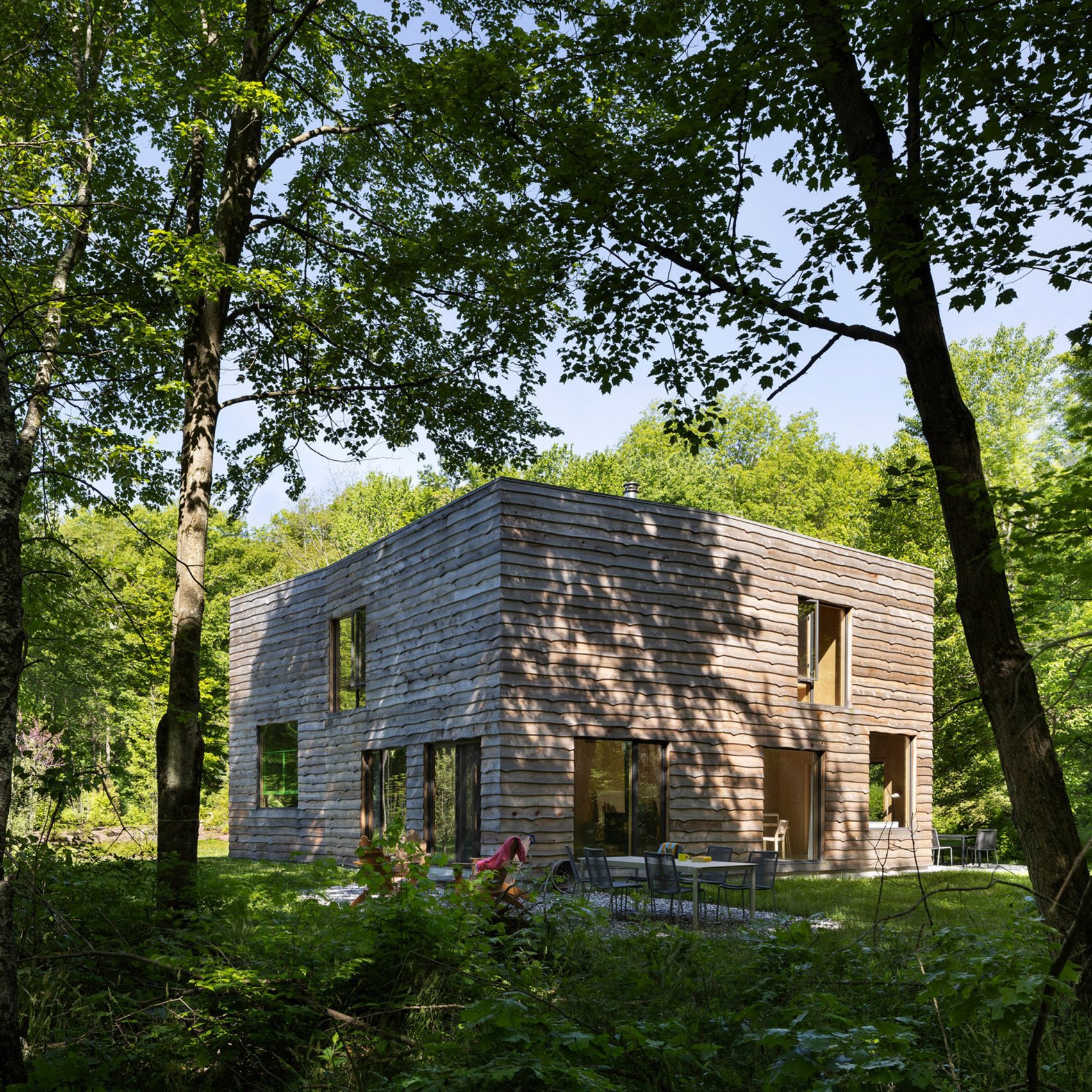 این خانه در زمینی جنگلی کنار دریاچه در دره هادسون واقع شده و شکل نامنظم و مکعبی دارد که از سازهای چوبی ساخته شده و با تختههای سدر با لبه طبیعی پوشیده شده است. این خانه دریاچهای را بنیانگذاران nArchitects، اریک بونگه و میمی هوآنگ، بهعنوان یک پناهگاه پایدار در دل طبیعت برای خود و دو فرزند نوجوانشان ساختهاند.