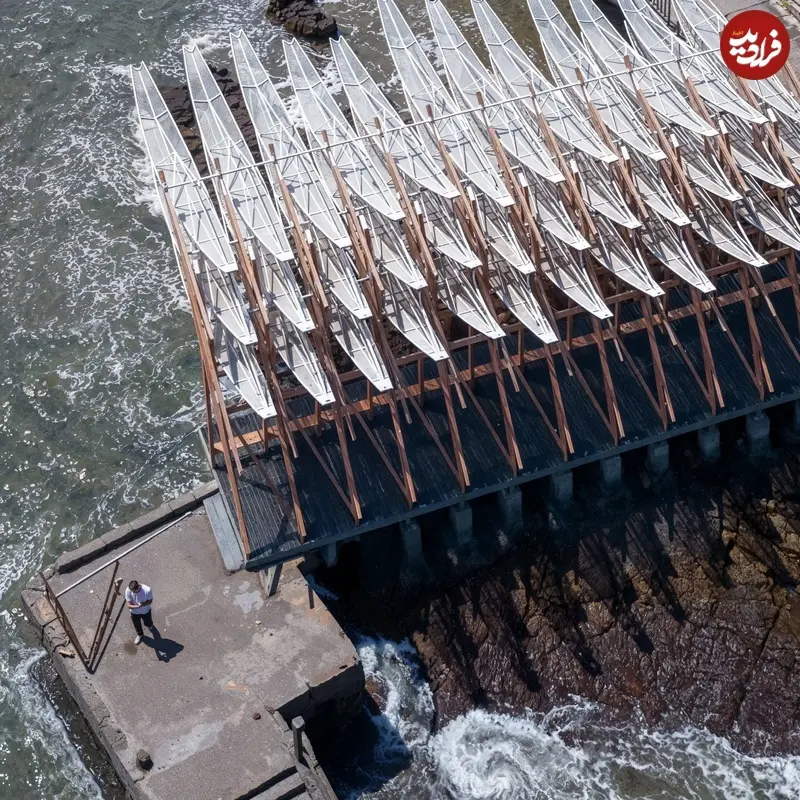 این غرفه بهعنوان دروازهای به جزیره دورافتاده چایشان طراحی شده و سقف آن شبیه بادبانهای برگمانند است. استودیو محلی GN Architects از تورهای ماهیگیری برای ساخت ۳۶ تیغه باریک سقف استفاده کرده که هر یک به محور مرکزی متصل است و با نسیم دریا حرکت میکند. بازدیدکنندگان میتوانند روی نیمکتهای پایه سازه چوبی بنشینند و به تماشای دریا بپردازند. برای مقاومت در برابر بادهای شدید اقیانوسی و طوفانها، سکوی فولادی تقویتشدهای زیر قاب سبک چوبی اضافه شده است.