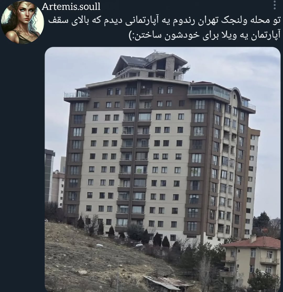 در ولنجک تهران، جایی که مترمربعها با رویا قیمتگذاری میشوند، گاهی معماری دست به کارهایی میزند که آدم را وادار میکند دوباره به مفهوم «خانه» فکر کند. اینبار نه با یک برج عجیب یا نمای خاص، بلکه با یک اتفاق غیرمنتظره: یک ویلای کامل که روی سقف یک آپارتمان ساخته شده است.