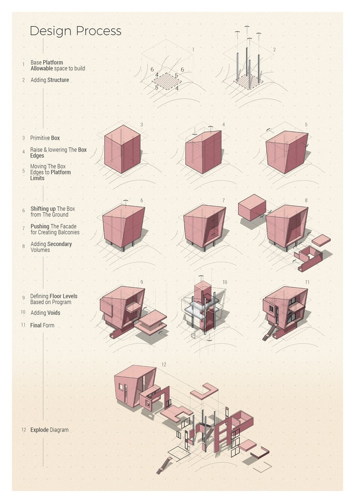 داستان معماری خانه باغ ابرا با یک مربع ۴×۵ با کنسول هایی در طرفین شروع می شود که یک سکوی ۶×۶ ایجاد می کند. خانه باغ ابرا در ۴ سطح شامل زیرزمین، اتاق نشیمن، فضای استراحت و اتاق زیر شیروانی در نظر گرفته شده است که عرشه رصد پروژه را در خود جای داده است. فرآیند توسعه مفهوم به سمت بازتولید همزمان حجم و فضا در نمای معماری این خانه حرکت کرده تا رابطه عمیقی بین معماری و مخاطب ایجاد کند که فراتر از ترکیب فرم و حجم است.